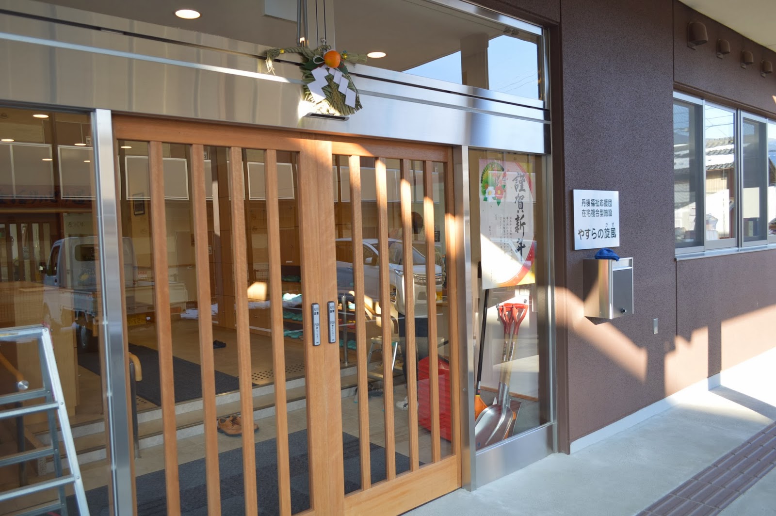 迎春準備ができた特養やすら苑の玄関、明日の元日は面会に来られた家族にぜんざいがふるまわれます。中に入るお餅はのちろんこの間餅つき大会でついたお餅です。
